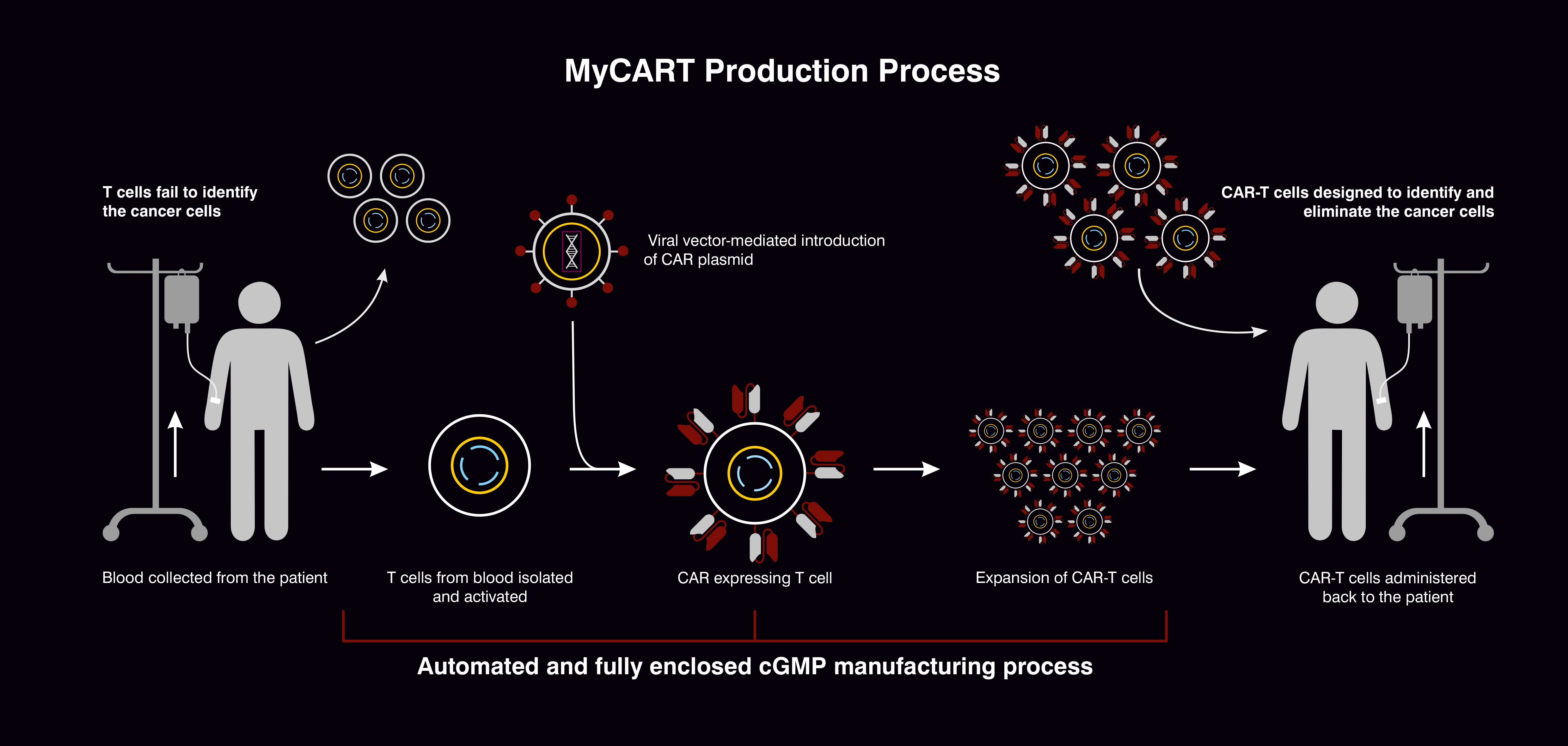 MyCART is an advanced autologous CAR T-cell therapy where your own T cells are redesigned to fight cancer cells. In MyCART, your T cells are genetically engineered to produce an artificial T cell receptor or CAR (Chimeric Antigen Receptor). The CAR is an antibody fragment that is directed against the unique receptors found on cancer cells. This rational design allows the CAR T-cells to specifically recognise cancer cells and effectively destroy them in the process. Furthermore, besides providing robust anti-tumour activity, CAR T-cells also persist for long periods of time in turn reducing risk of relapse.