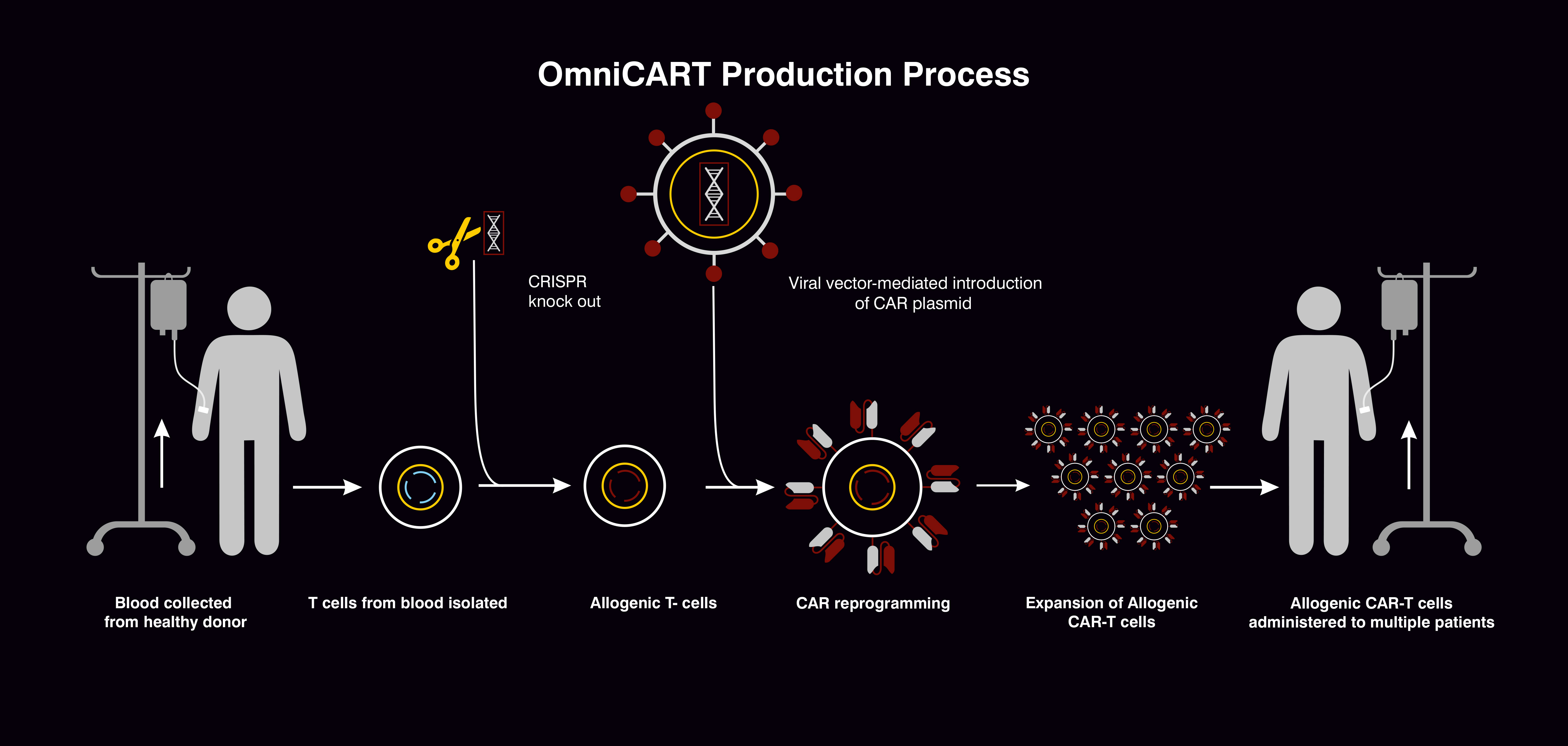 OmniCART is a next-generation allogenic (universal) CAR T-cell therapy where human cells are redesigned to fight cancer cells. The biggest challenge in allogenic CAR T-cell therapy is the graft-vs-host response that comes from foreign T cells. At Micro, we use CRISPR to knock-out genes from the T-cells that are responsible for graft-vs-host disease, hence making them allogenic. Furthermore, we also use CRISPR to reduce T cell apoptosis and to improve their effectiveness.