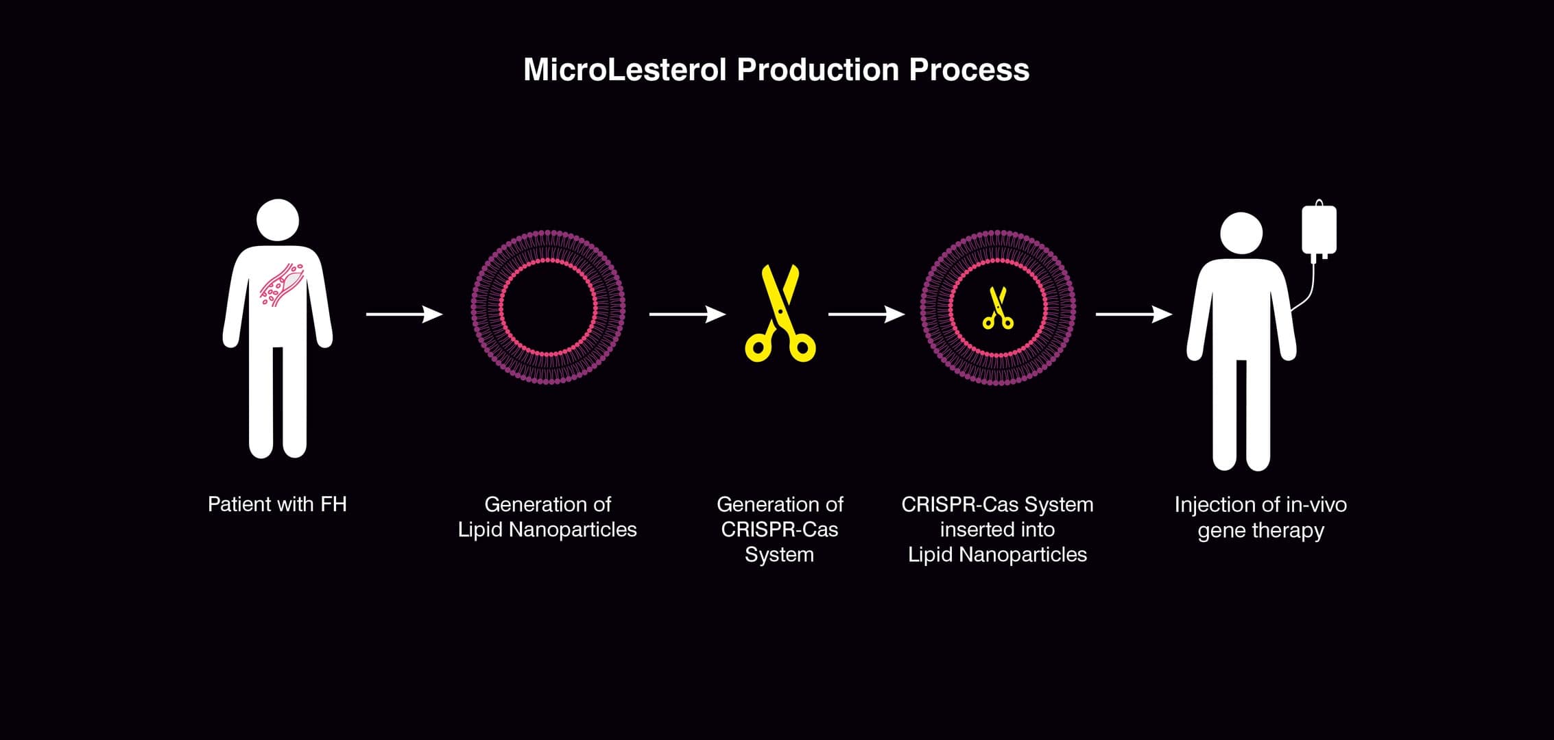 MicroLesterol is a next-generation, in vivo gene therapy that will present a novel and universal solution to treat FH by using CRISPR technology to permanently lower LDL levels in the blood, making this a single-course solution to the disease.